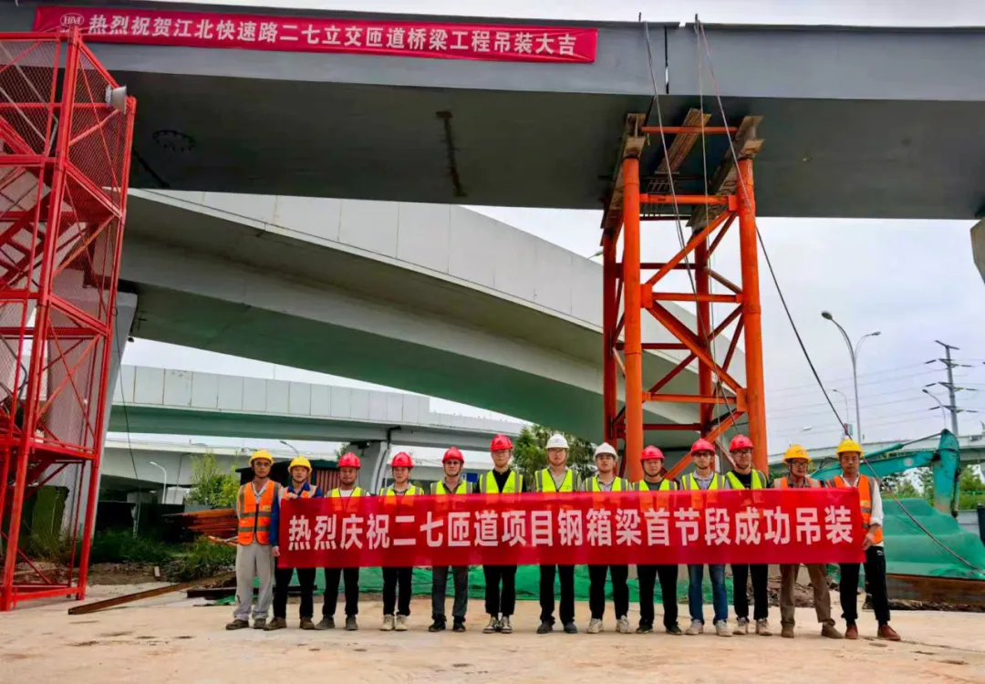 項目直擊丨江北快速路二七立交右轉匝道項目鋼箱梁首節(jié)段成功架設